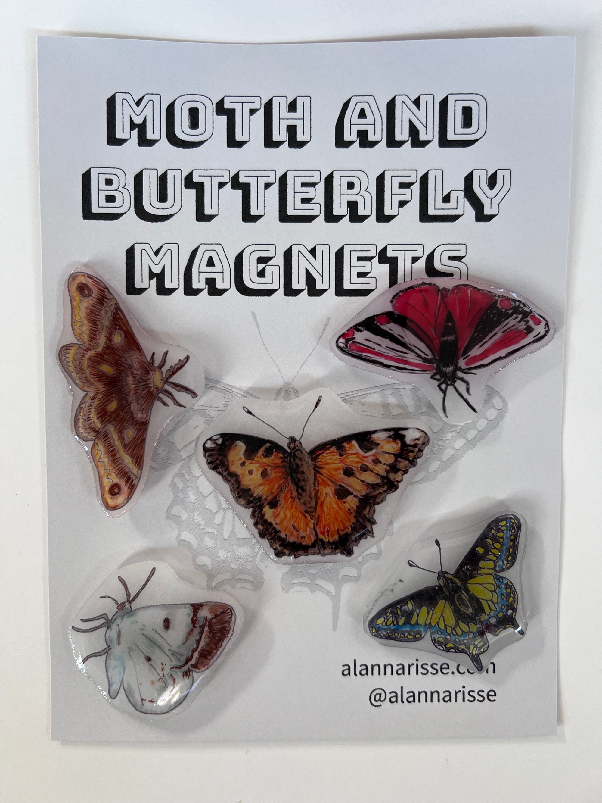 5 shrinky dink magnets of moths and butterflies. Drawn by Alanna Risse, resin coated. Shipping to US only. $8 for first item,. $1 for each additional item.