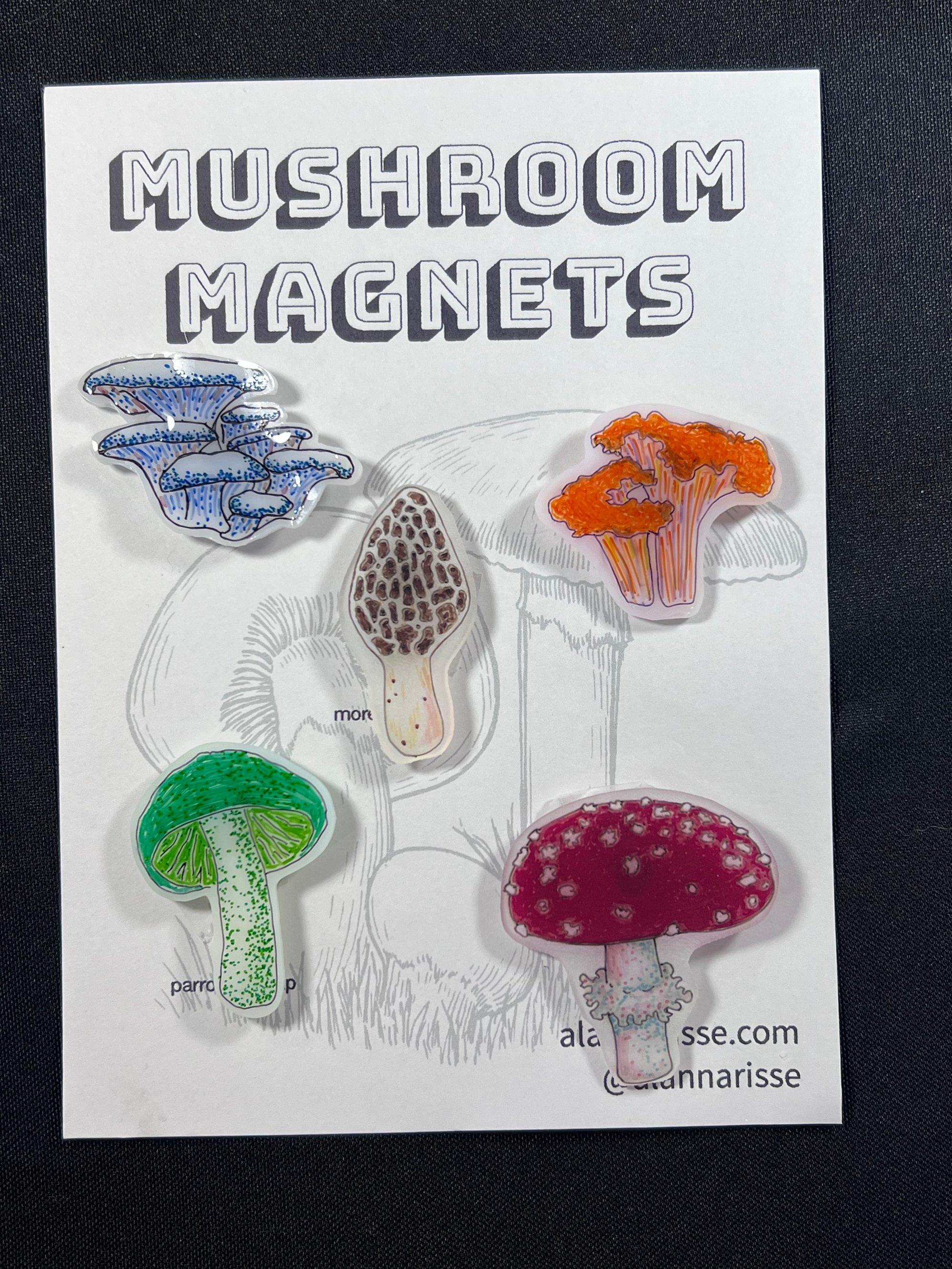 Set of 5 shrinky dink mushroom magnets. Uses strong rare-earth magnets.